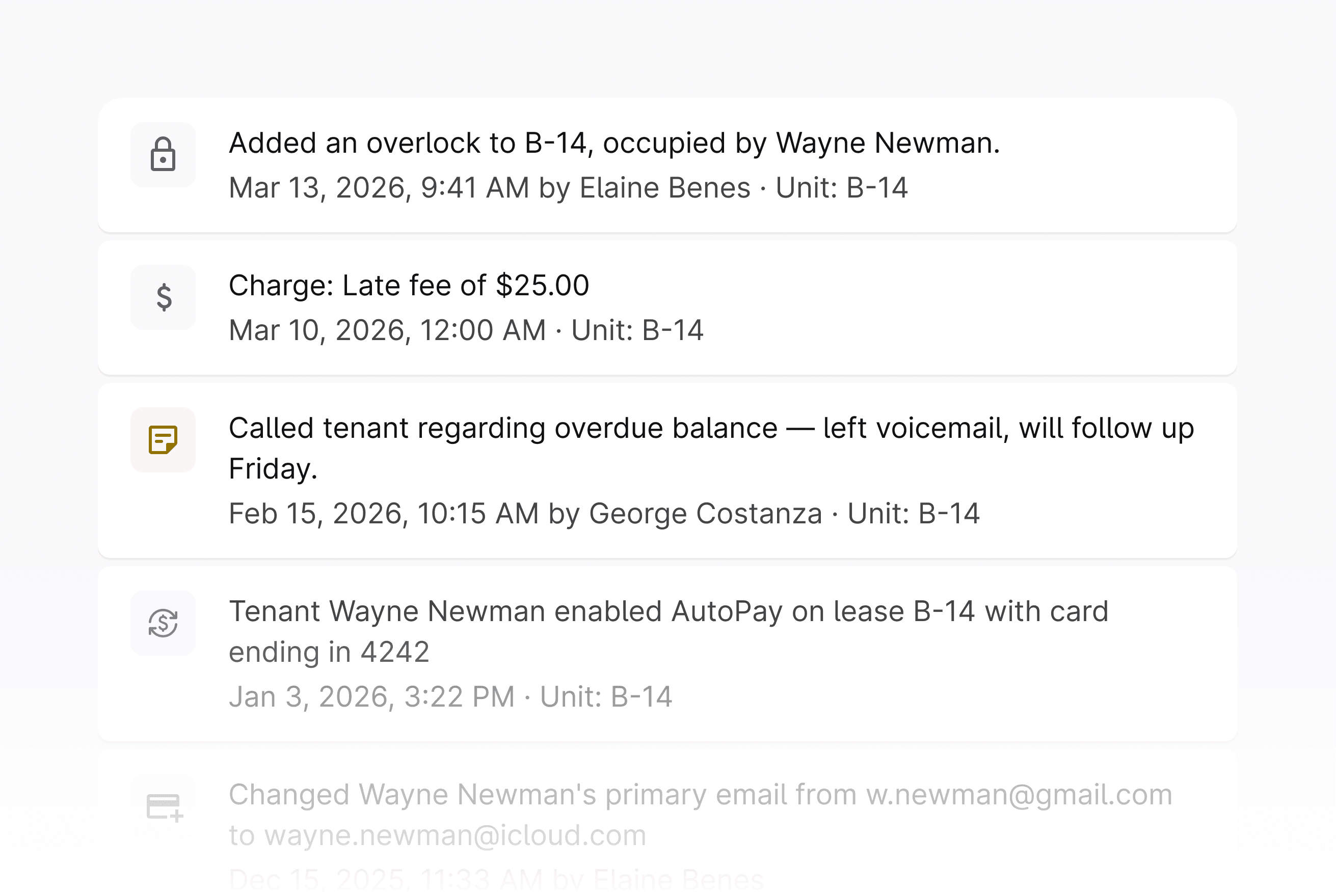 See every interaction, payment and status change for each tenant in one timeline. Your team has a full audit trail for compliance, disputes and day-to-day account management.